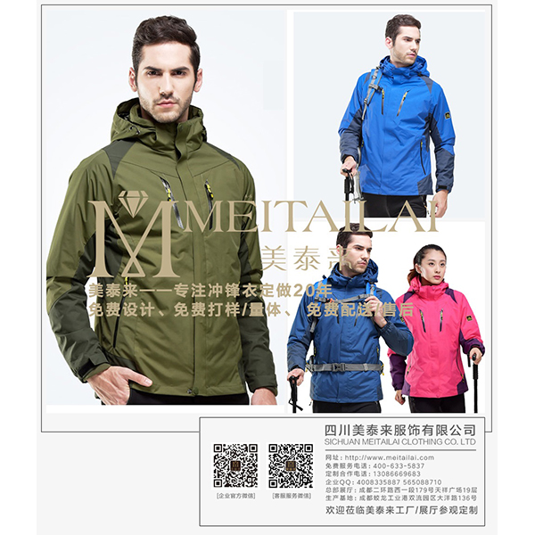 1.如果是批量定做冲锋衣,一定要选择正规的冲锋衣厂家!有实体的服装厂家,通过权威质量体系认证的绵阳服装公司(例如:美泰来制衣厂,企业通过了ISO9001等质量体系认证,工厂在蛟龙工业港双流园区欢迎来公司工厂参观)